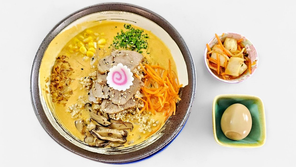 Ramen noodle soup ( Soup made from Sesame & soy bean & vegetables ), PORK, Shitake mushroom, onion, carrot, bean sprouts, sweet corn, egg, served with Kimchi