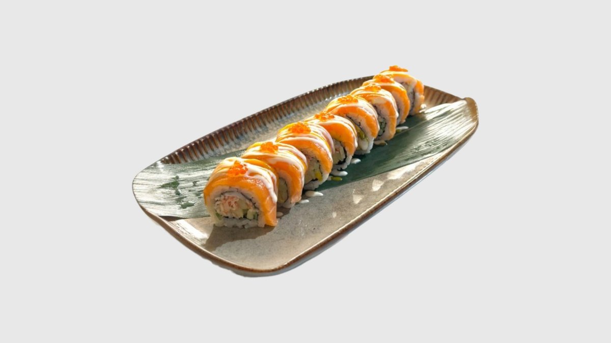 - INSIDE: Steamed prawn, avocado, Philadelphia cheese - OUTSIDE/COVERED: rare-flamed salmon and tuna, Teriyaki- Spicymayo, spring onion 8 pieces