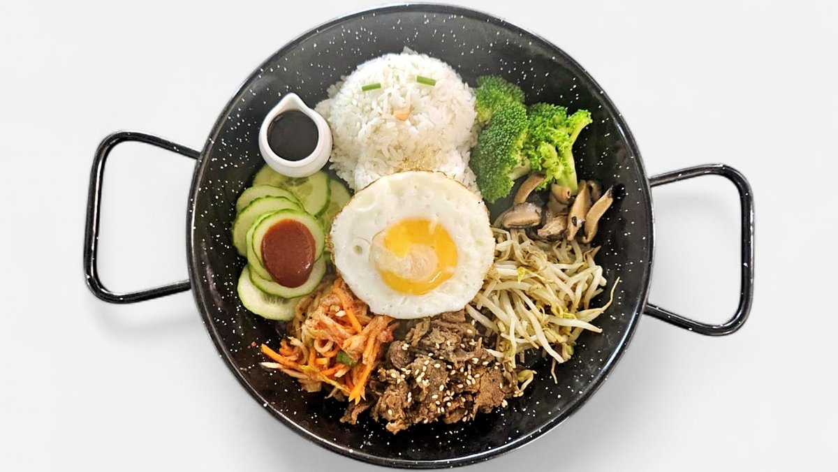 Jasmine rice, broccoli, cucumber, bean sprout, kimchi sunny-side up egg, Daddy style beef, Bulgogi sauce, sesame