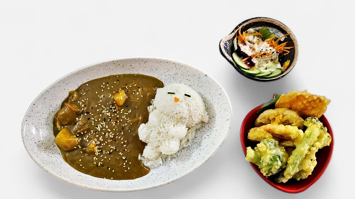 Japanese curry sauce with potato and carrot, tempura fried vegetable (sweet potato, broccoli, asparagus, lotus root), sesame, served with jasmin rice
