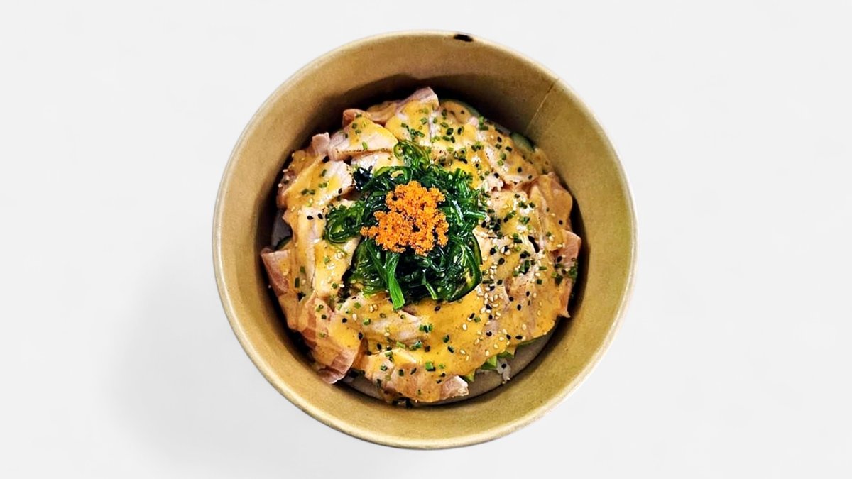 FLAMED RARE salmon in SPICYMAYO sauce, caviar, sushi rice, avocado, cucumber, Wakame, Teriyaki sauce, sesame, spring onion