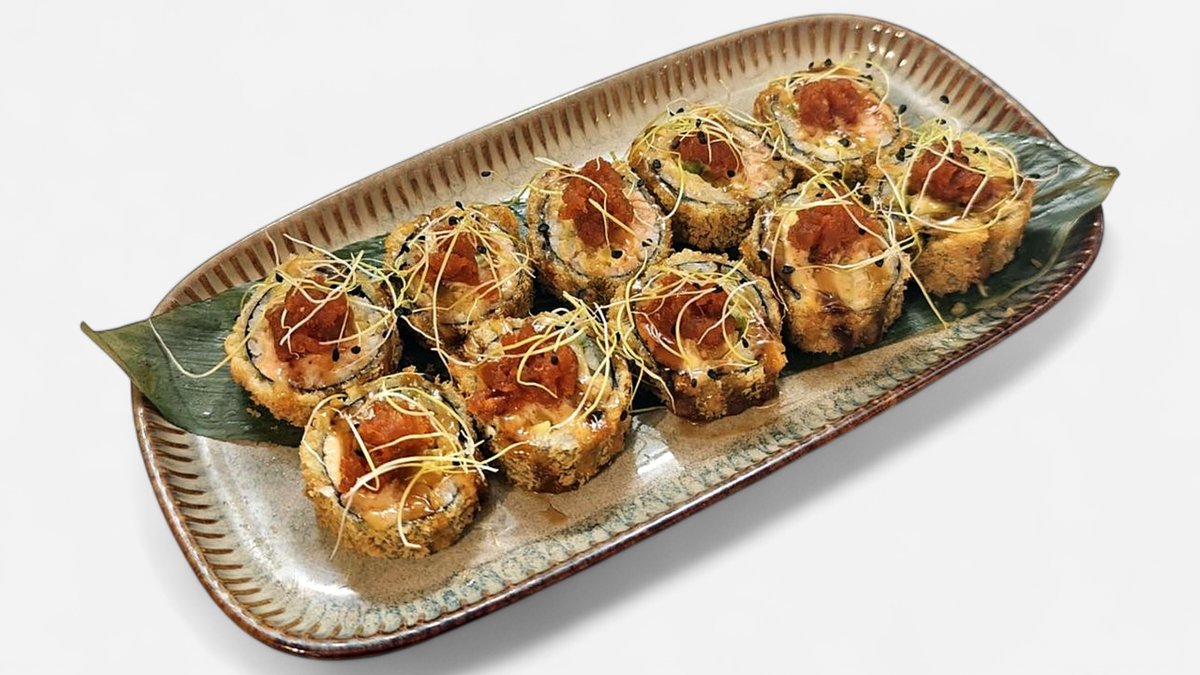 deep fried roll : IN: crab cream, avocado, cucumber TOPPING: creamy prawn, sesame, Passion Fruit-Creamy sauce 10 pieces