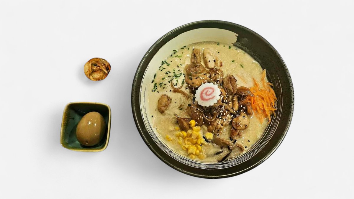 Ramen noodle soup ( Soup made from Sesame & soy bean & vegetables ), MARINATED CHICKEN, Shitake mushroom, onion, carrot, bean sprouts, sweet corn, egg, served with Kimchi