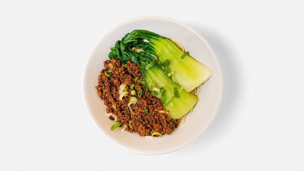 Čerstvé nudle, mleté hovězí maso, pak choi, chilli.