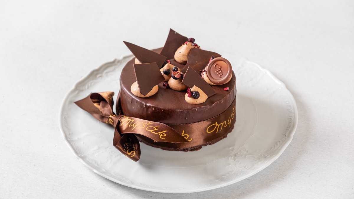 kakaový korpus, karamelovo-čokoládový krém, hořká čokoláda; cca 750g, doporučujeme pro 6 osob