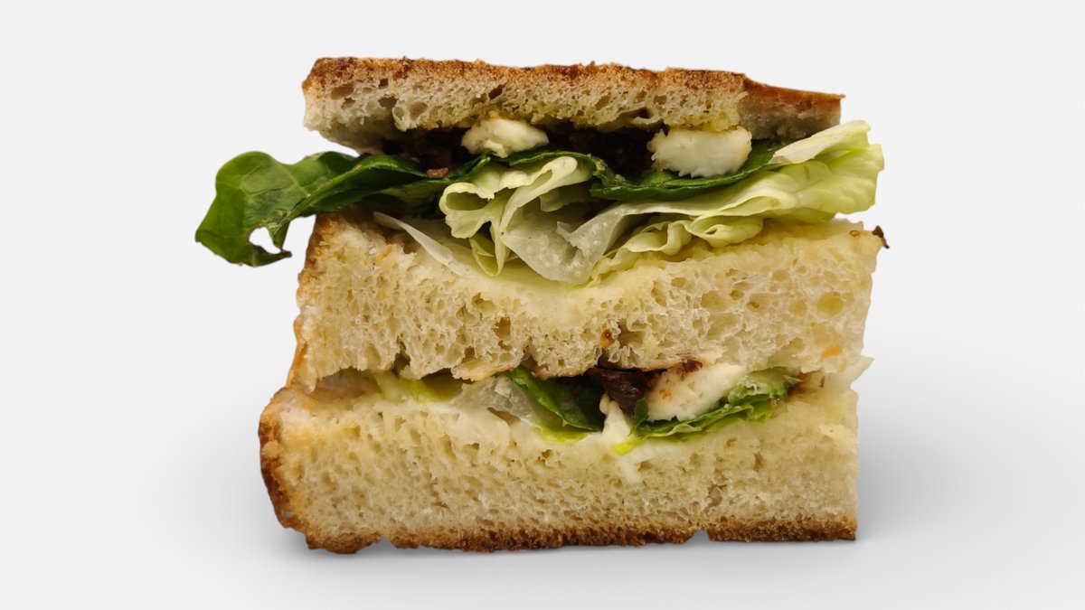 🇨🇿 Sendvič s nadýchanou houskou, čerstvou zelení, bazalkovým pestem, oříšky a jemnou mozzarellou. 🇬🇧 A sandwich with a fluffy bun, fresh greens, basil pesto, nuts, and mozzarella. (1,3,7,8)