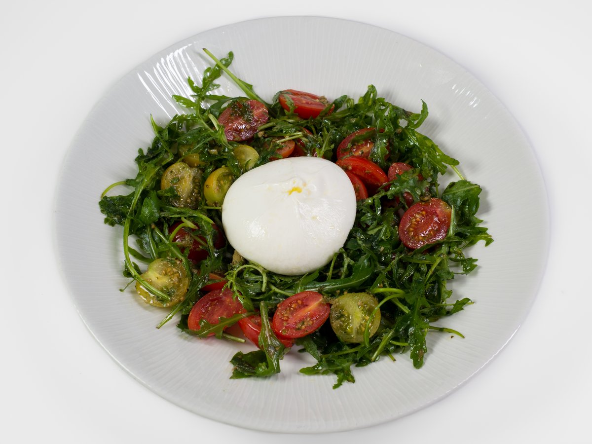 cherry rajčata, pomeranč, jogurtový dressing, mix salátů, ozdobený tklapi ze sušeného ovocného pyré