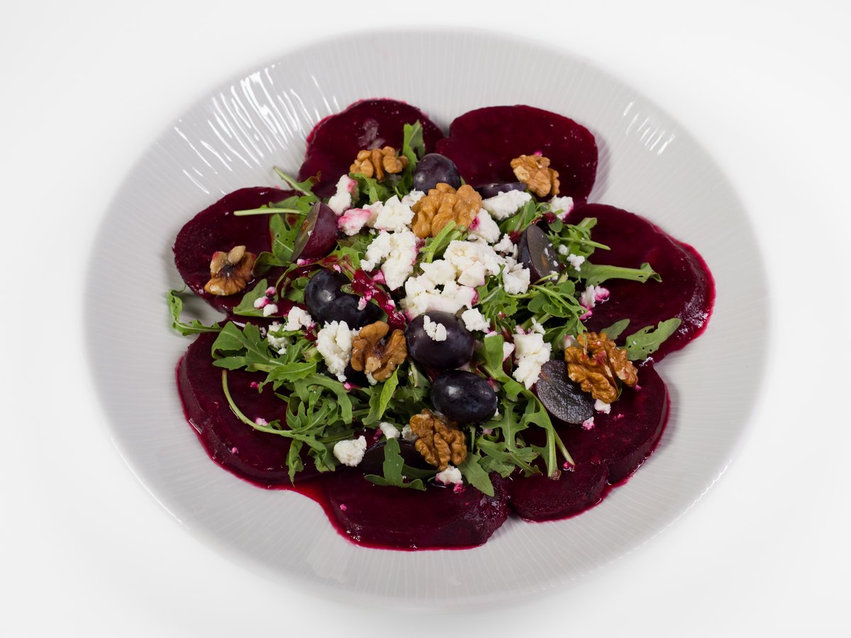 krájená červené řepa, marinovaná v gruzínské švestkové omáčce, tkemali"s feta sýrem