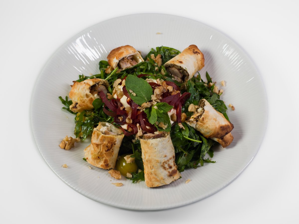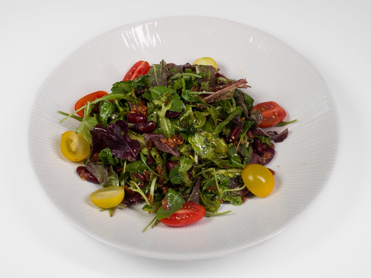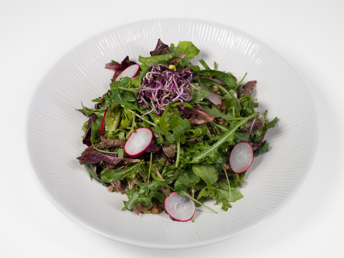 jemné hovězí maso s křupavou ředkvičkou, vařenými pšeničnými zrny a směsí salátů, přelité omáčkou z dijónské hořčice.