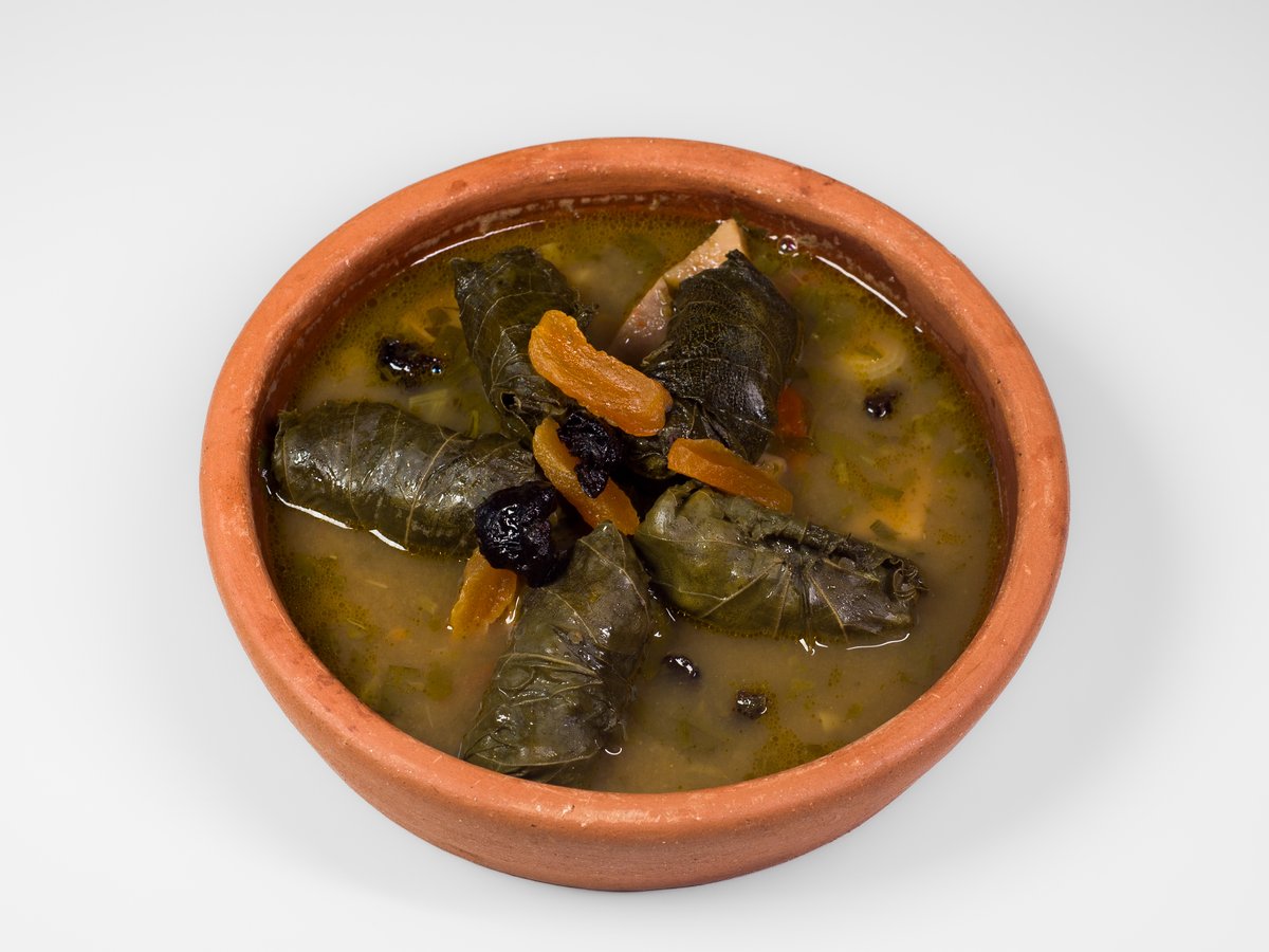 nasekané vepřové a hovězí maso zabalené ve vinných listech ochucené kořením, bylinkami and dried fruits