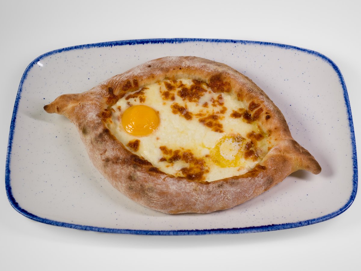 tradiční gruzínské pečivo ve tvaru loďky plněné variací sýrů s vejcem navrchu