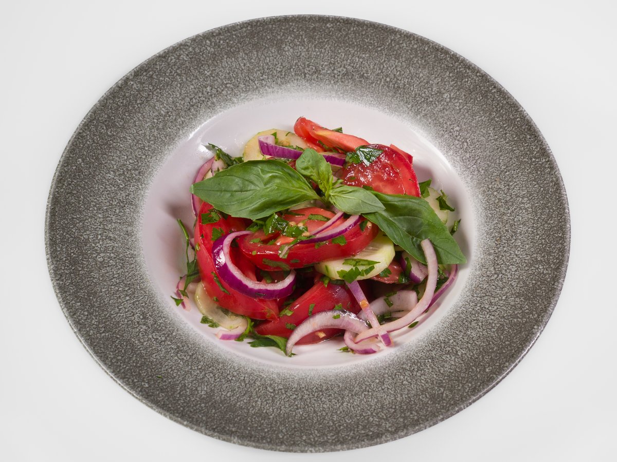 krájená rajčata a okurka s červenou cibulí a bylinkami