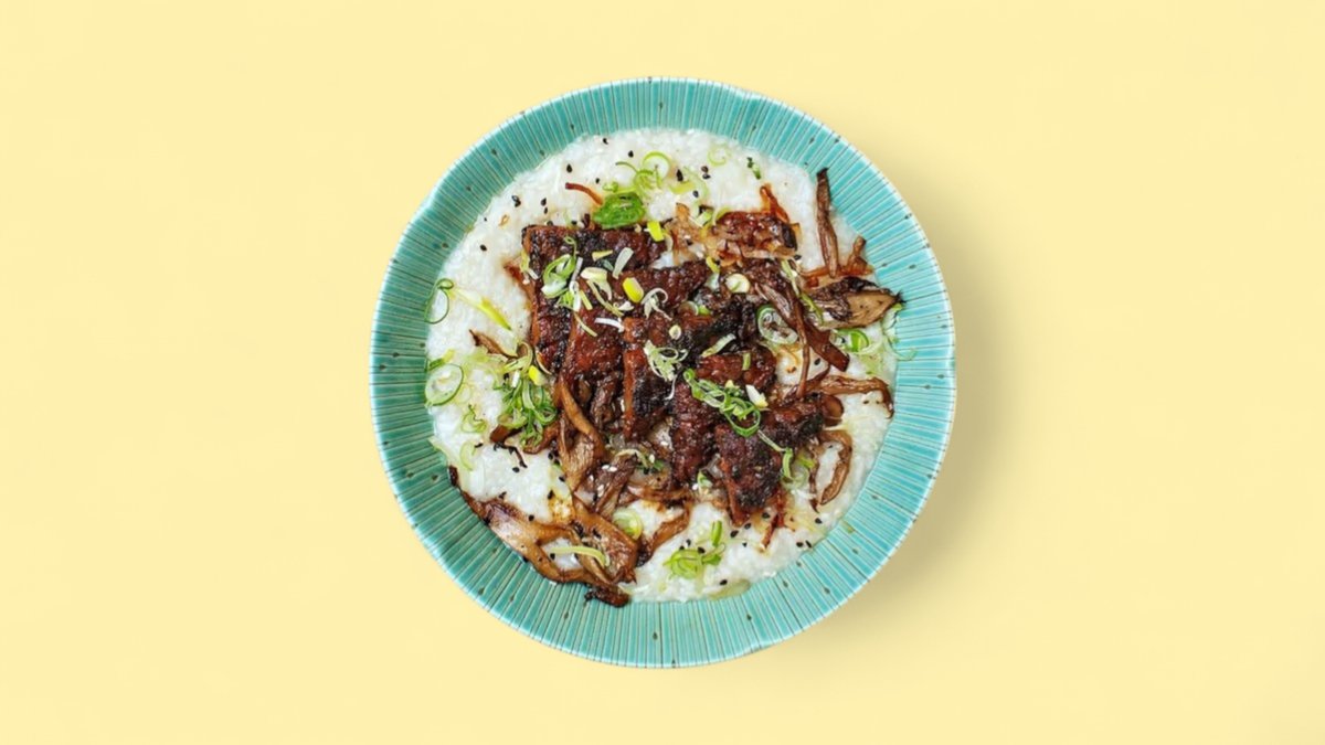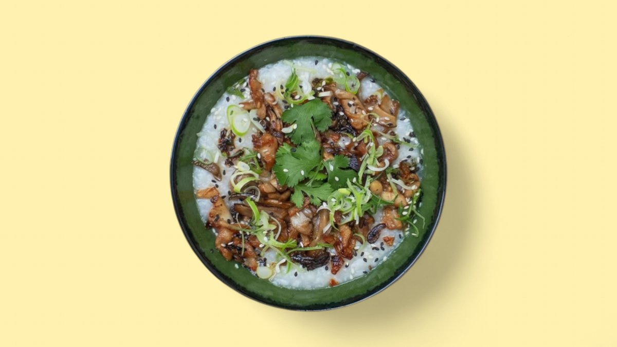 Rýžová kaše congee s hlívou a tempehem. 💛