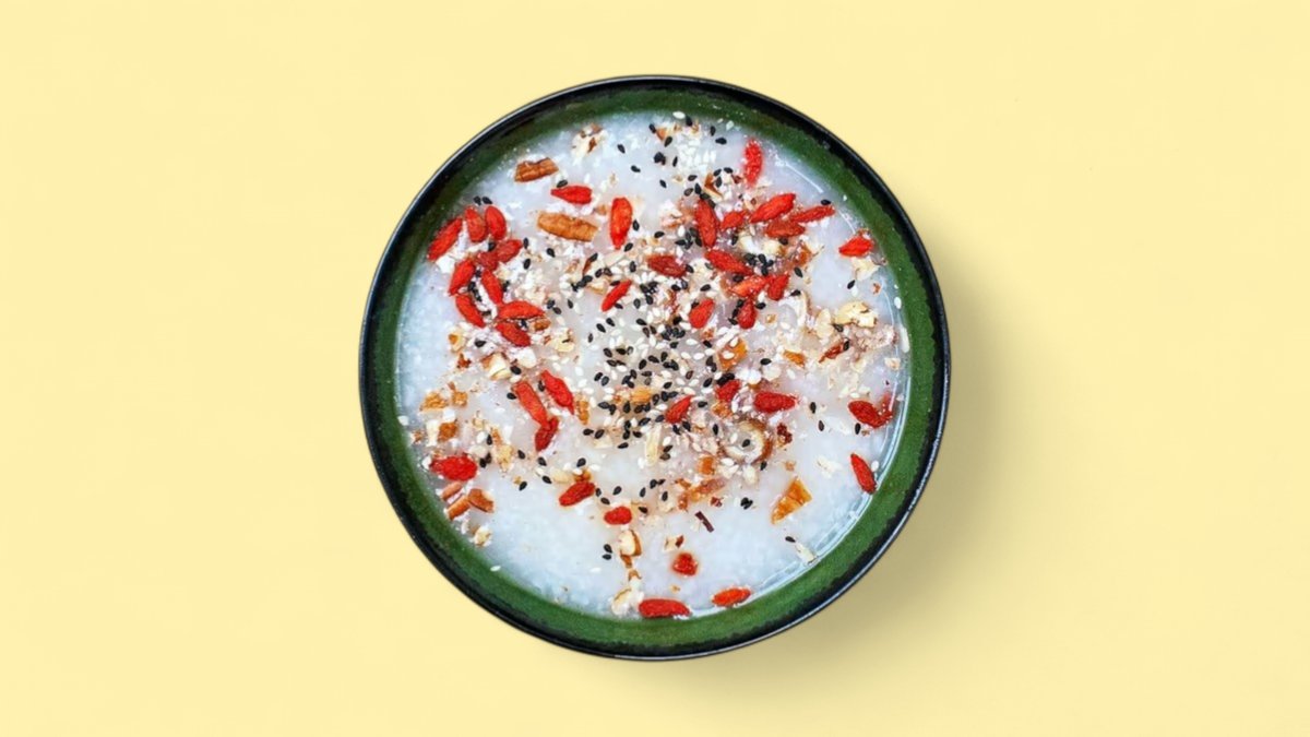 Sladká rýžová kaše congee s datlemi, ořechy, goji a kandovaným zázvorem. 💛