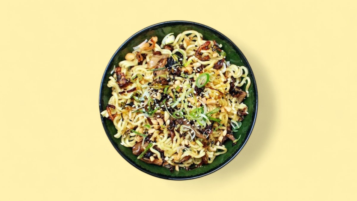 Veganské nudle s olejem z jarní cibulky, hlívou a arašídy. 💛