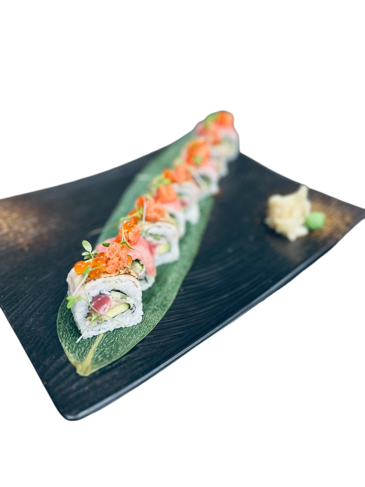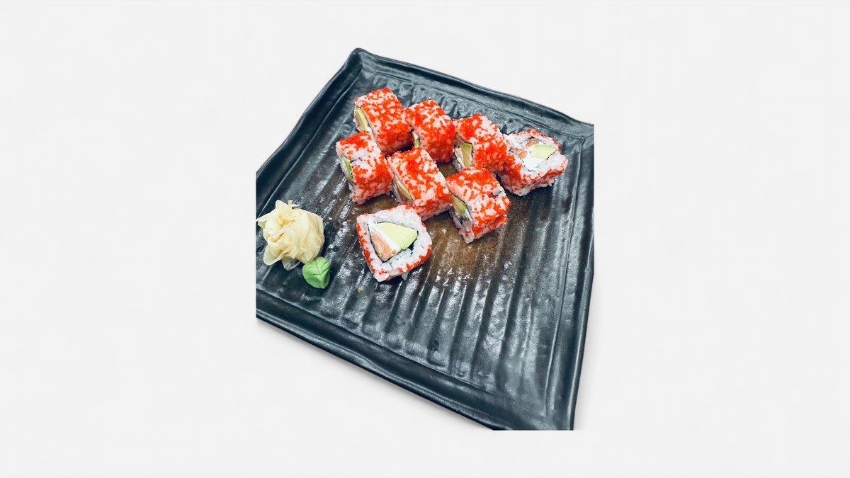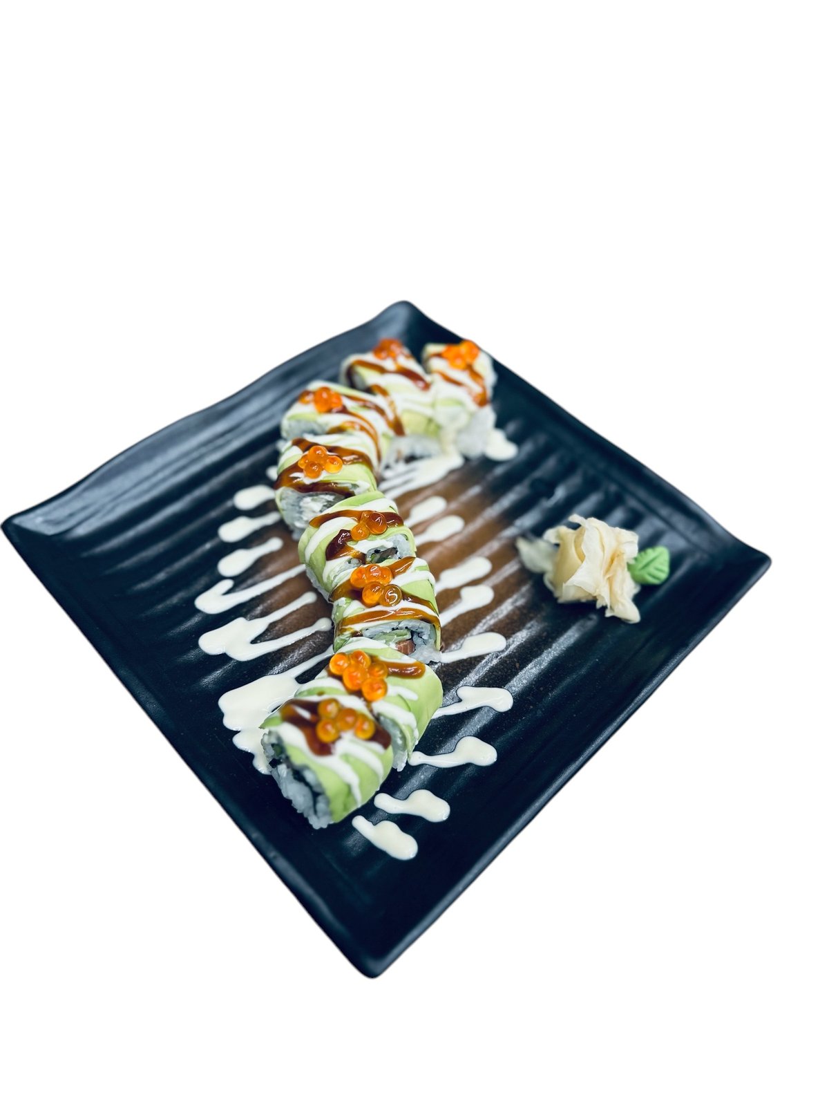 In: Losos, okurka, krémový sýr Up: Avokádo, teriyaki-inari dresink, kaviár, ikura In: Salmon, cucumber, cream cheese Up: Avocado, teriyaki-inari sauce, caviar, ikura