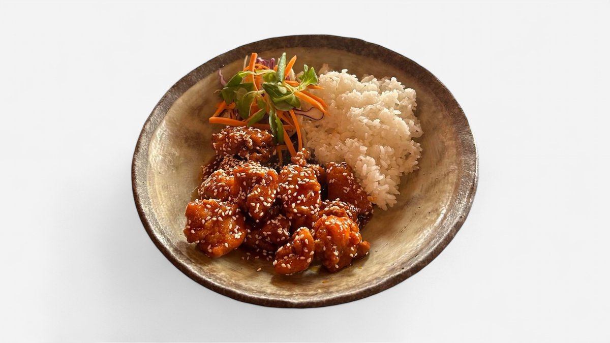 CZ: Kousky smaženého kuřecího masa obalené ve směsi z pšeničné mouky a bramborového škrobu, naše teriyaki omáčka, sezamová semínka, rýže EN: Pieces of fried chicken coated in a mixture of wheat flour and potato starch, served with our teriyaki sauce and rice