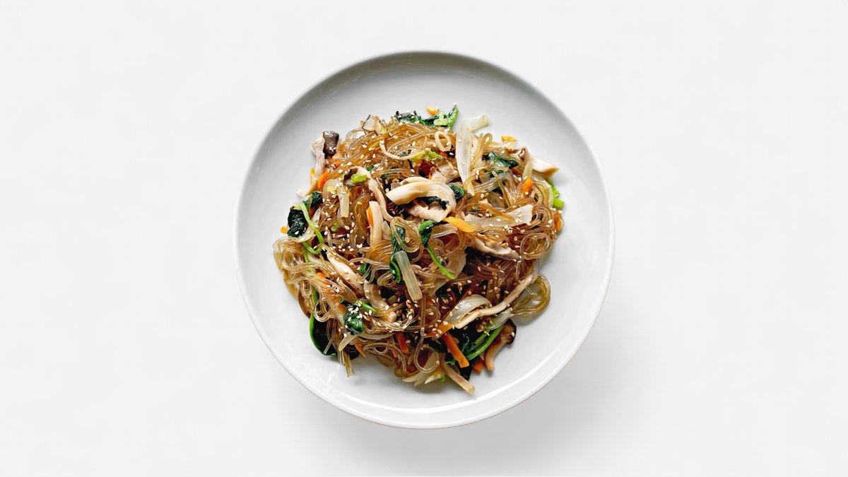 CZ: Restované korejské skleněné nudle se sladkou paprikou, cibule, mrkev, žampiony, houby shitake, sojová omáčka, sezamový olej, sezamová semínka EN: Stir-fried Korean glass noodles with sweet peppers, onions, carrots, mushrooms, shitake mushrooms, soya sauce, sesame oil, sesame seeds