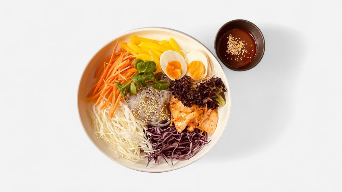CZ: Velmi oblíbené Korejské jídlo. Velká miska s vařenými skleněnými nudlemi, kde je na vrchu naskládaná sezónní zelenina jako je mrkev, zelí, salátové listy, nakládaná ředkev, marinované vajíčko, houby shitake, sladko-pikantní omáčka EN: Is very popular Korean dish. It is a large bowl of boiled glass noodles topped with seasonal vegetables such as carrots, cabbage, lettuce, pickled radish also known as takuan, boiled marinated egg, shitake mushroom, sweet and spicy sauce