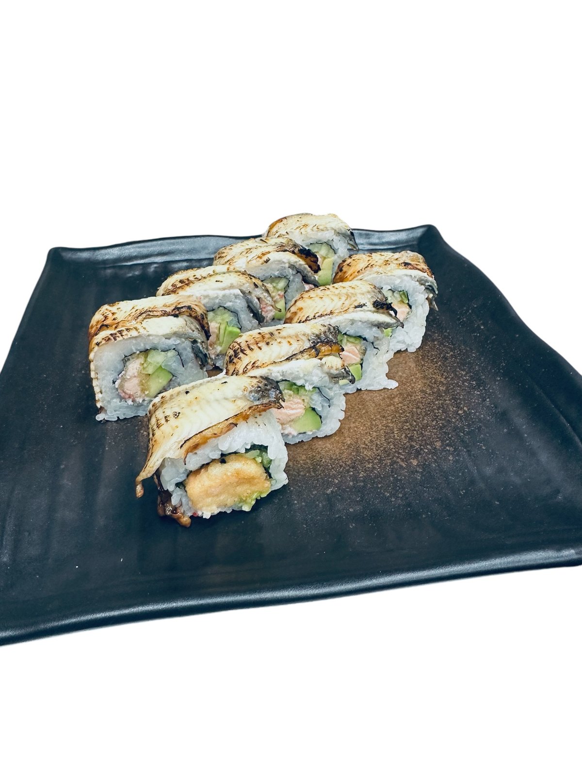 In: Losos v tempuře, avokádo, okurka, krabí krém Up: Marinovaný úhoř, unagi omáčka, sezam In: Salmon in tempura dough, avocado, cucumber, crab cream Up: Marinated eel, unagi sauce, sesame seeds