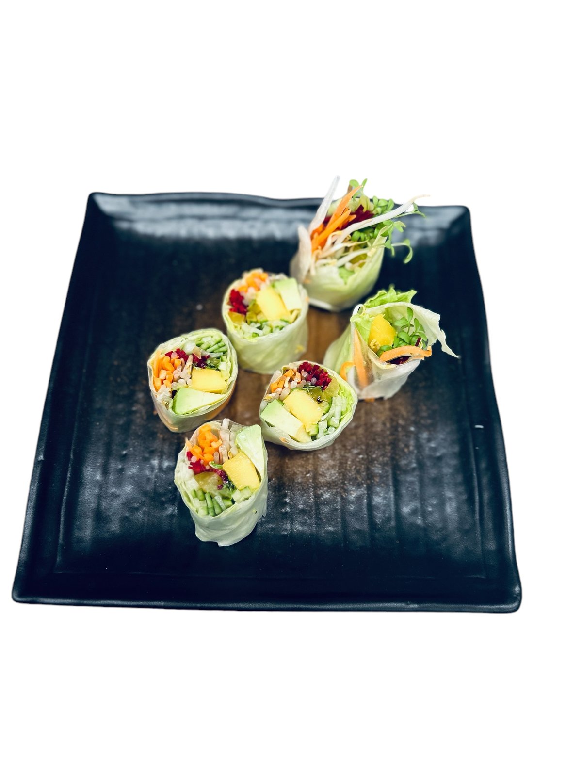 CZ: Sushi rýže, vegetariánská teriyaki omáčka, ponzu dresink, čerstvá zelenina, jarní cibulka, mango, mořské řasy sezamová semínka EN: Sushi rice, veggie teriyaki sauce, ponzu dressing, fresh vegetables, scallions, mango, wakame, sesame seeds