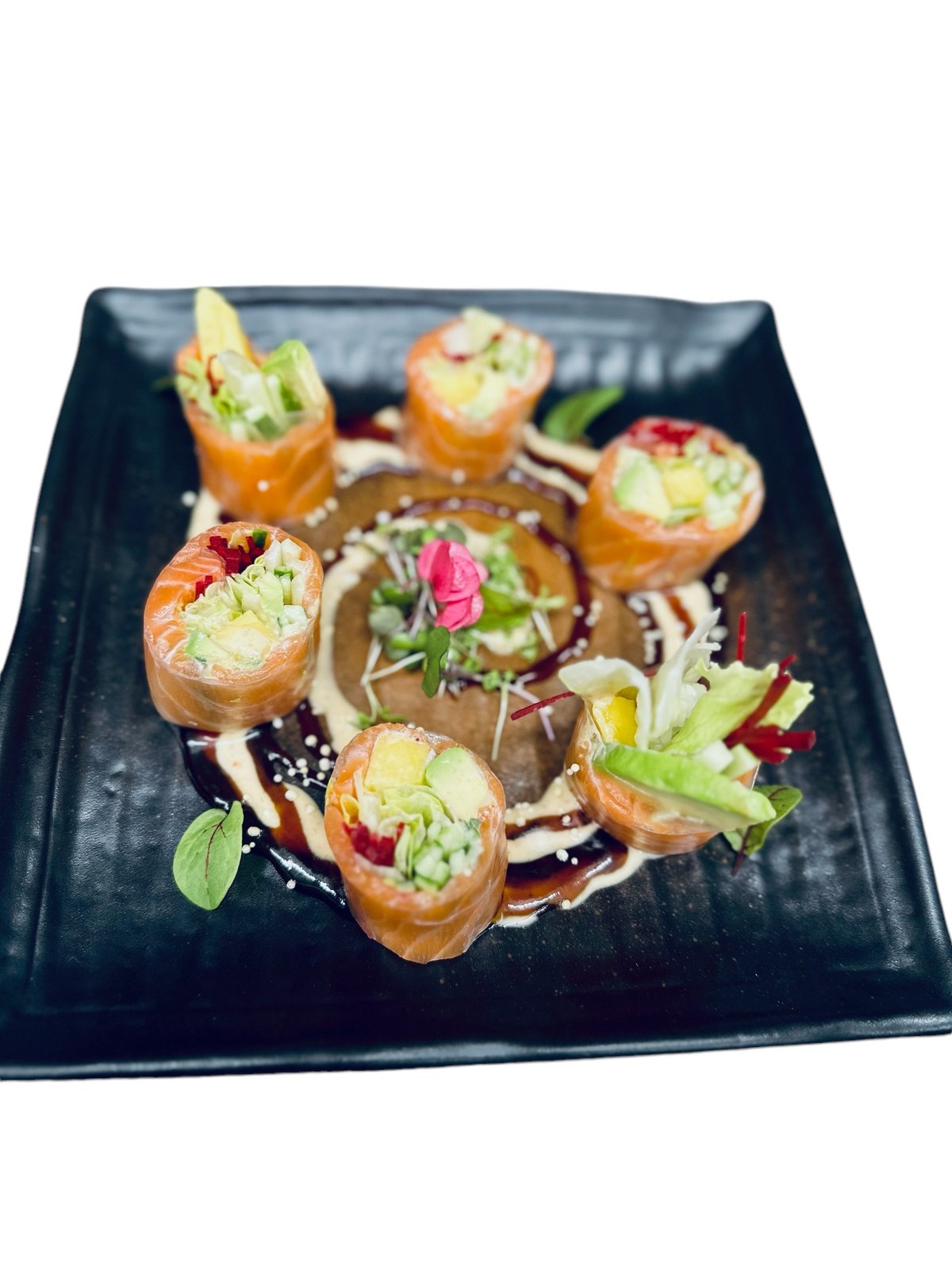 CZ: Sushi rýže, flambovaný losos, teriyaki omáčka, ponzu dresink, čerstvá zelenina, jarní cibulka, mango, mořské řasy sezamová semínka EN: Sushi rice, flambéed salmon, teriyaki sauce, ponzu dressing, fresh vegetables, scallions, mango, wakame, sesame seeds
