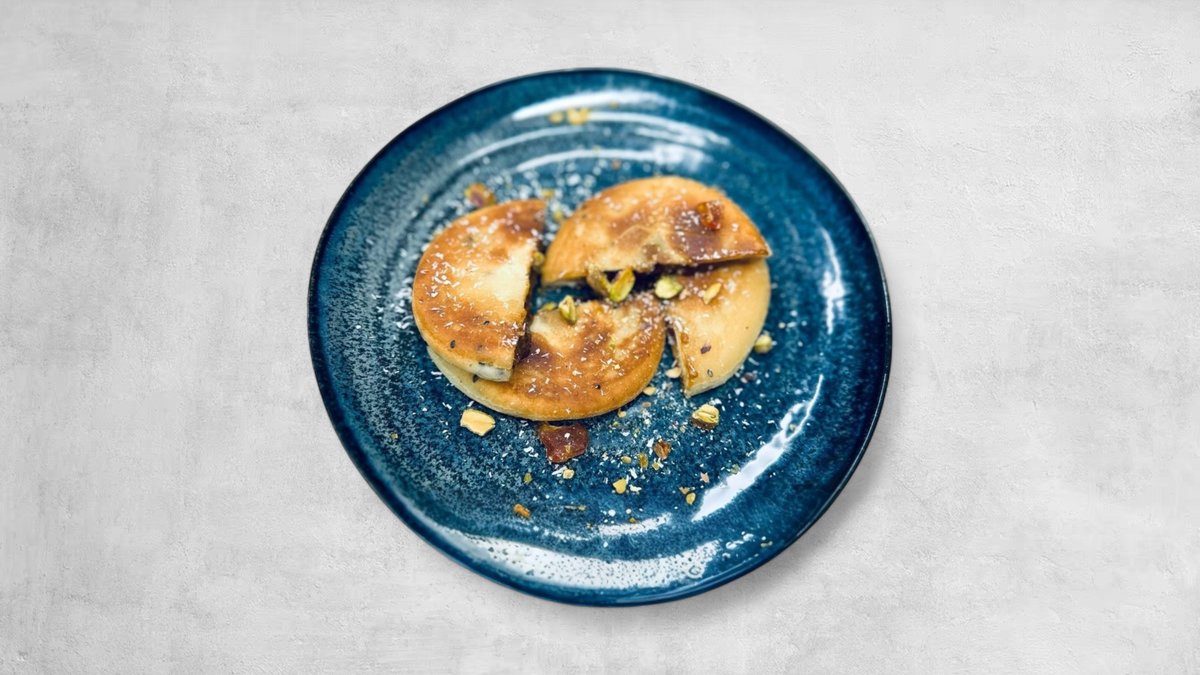 CZ: 2ks korejské palačinky plněné medem, skořicí, hnědým cukrem a arašídami. Pistáciový griliáš, kokos EN: 2pcs of Korean pancakes filled with honey, cinnamon, brown sugar and nuts. Pistachio caramel pieces, coconut