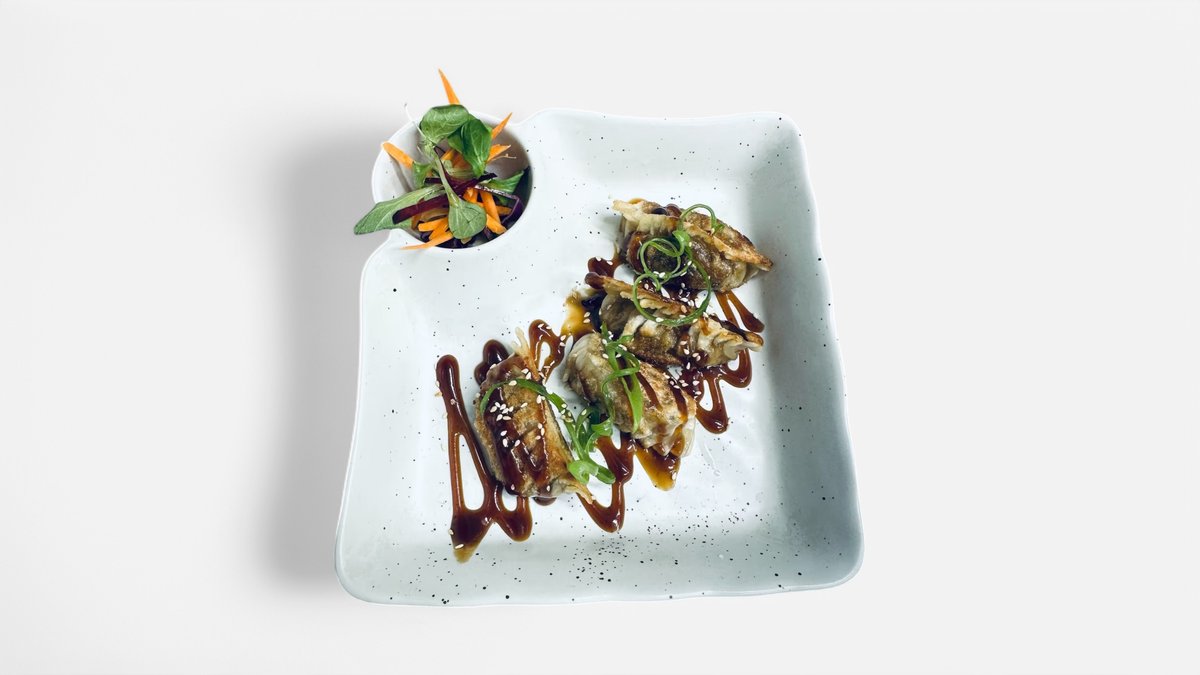 CZ: Gyoza jsou japonské knedlíčky smažené na pánvi, které jsou zespodu zlaté a křupavé, uvnitř jsou šťavnaté - tyto knedlíčky jsou z vepřového masa a zeleniny, flambovaný sýr na vrchu EN: Gyoza are Japanese pan-fried dumplings that are crispy and golden on the bottom, juicy on the inside - these dumplings consist of vegetable and pork, flambéed cheese on the top