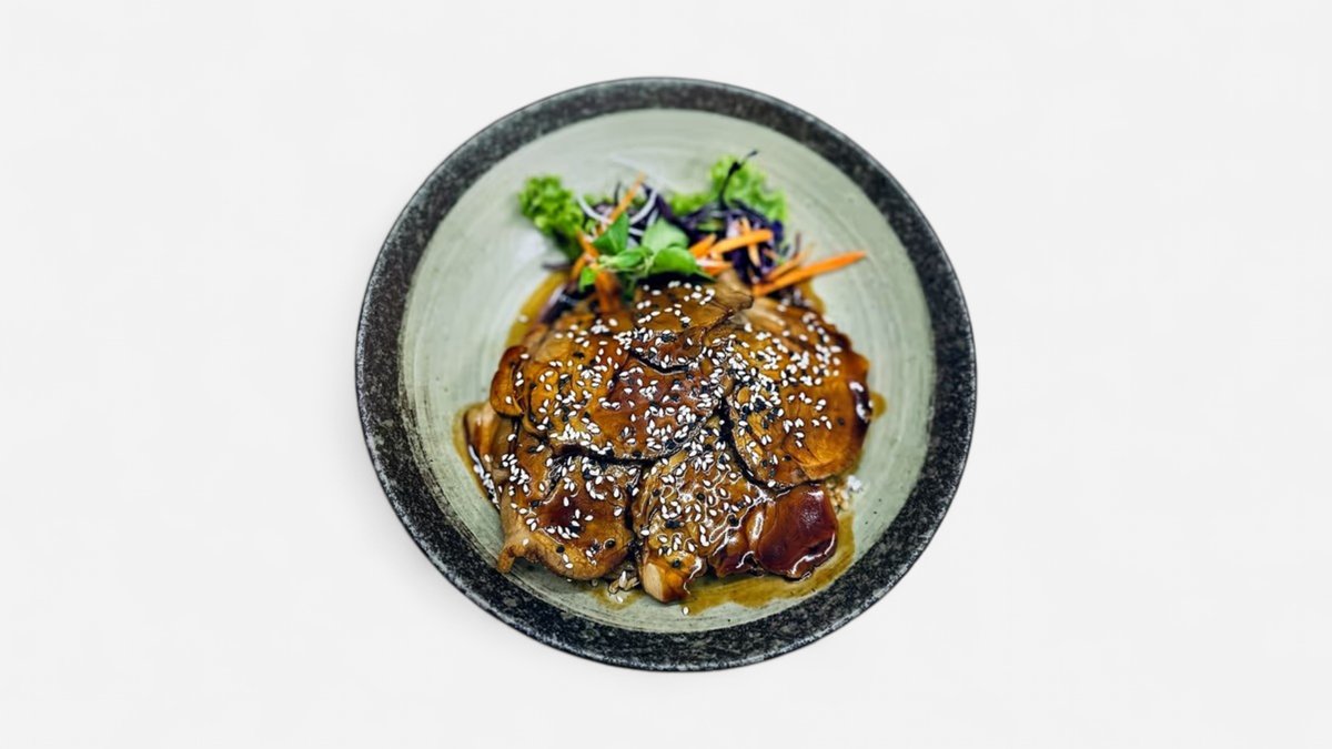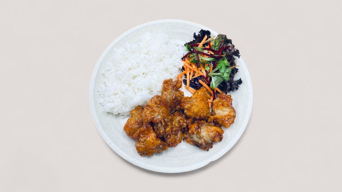 CZ: Smažené kuřecí stehenní kousky, marinované v zázvoru obalené ve směsi z pšeničné mouky a bramborového škrobu, teriyaki omáčka, naše majonéza, rýže EN: Juicy pieces of chicken thigh marinated in a mildly spicy ginger blend, coated in a crispy mix of wheat flour and potato starch. Served with teriyaki sauce, our house-made may, served with rice
