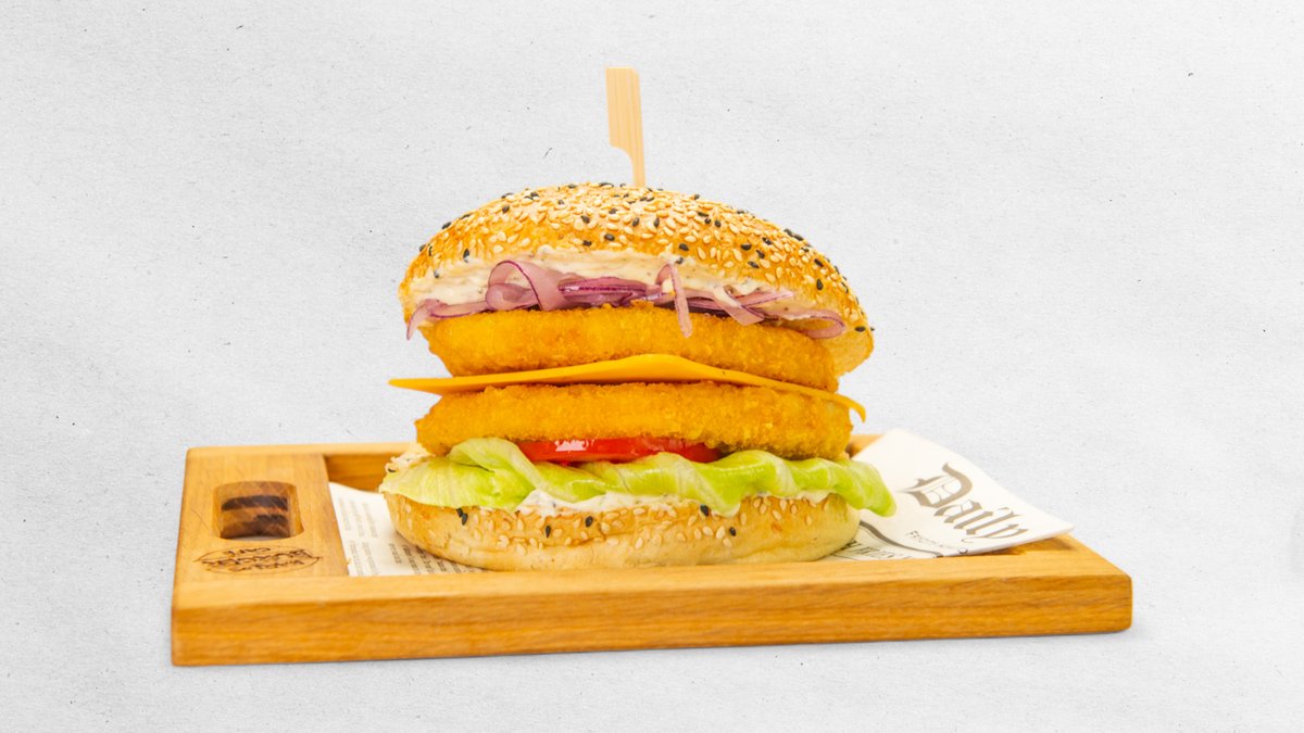 2× Kuřecí stripsy, Ledový salát, Sýr, Rajče, Nakládaný okurek, Cibule, Dresink, Bulka se sezamem