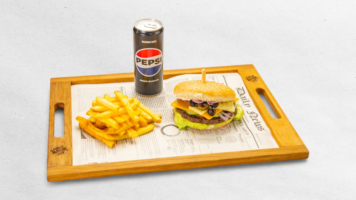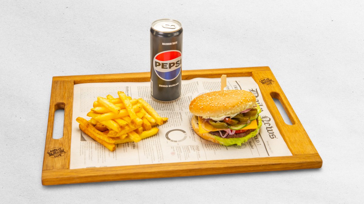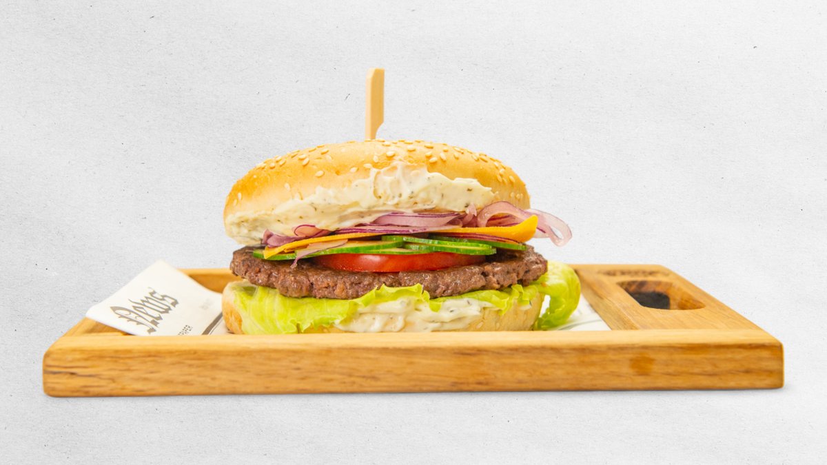 2×125 g Hovězí maso, Ledový salát, 2× Sýr, Rajče, Nakládaný okurek, Cibule, Dresink, Bulka se sezamem