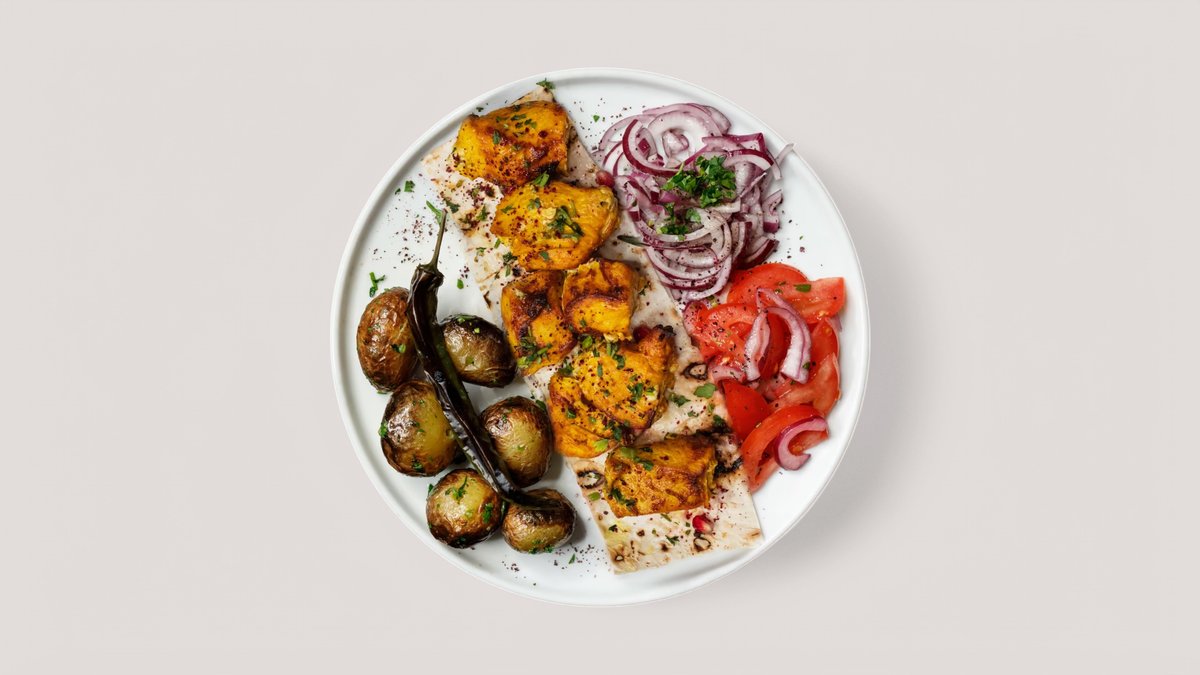 marinated boneless lamb 250g, tomato salad, onions, chilli pepper