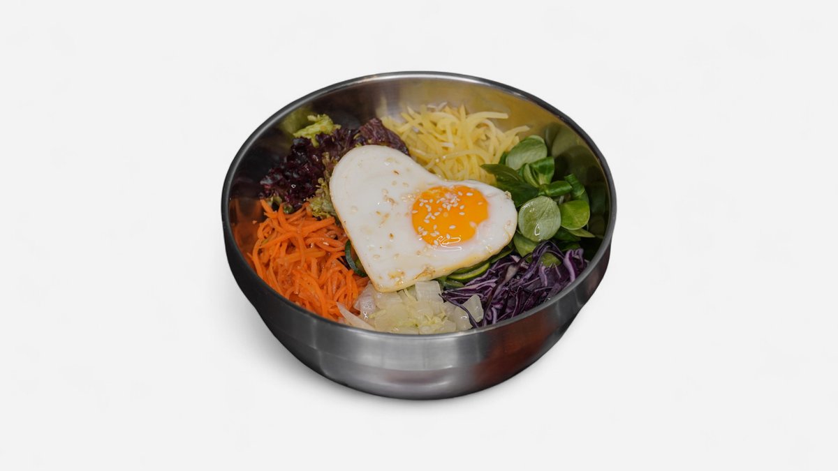 Mix zeleniny s rýží, sezamovým olejem a chilli omáčkou. Mixed rice and vegetables. Served with spicy bibim sauce.