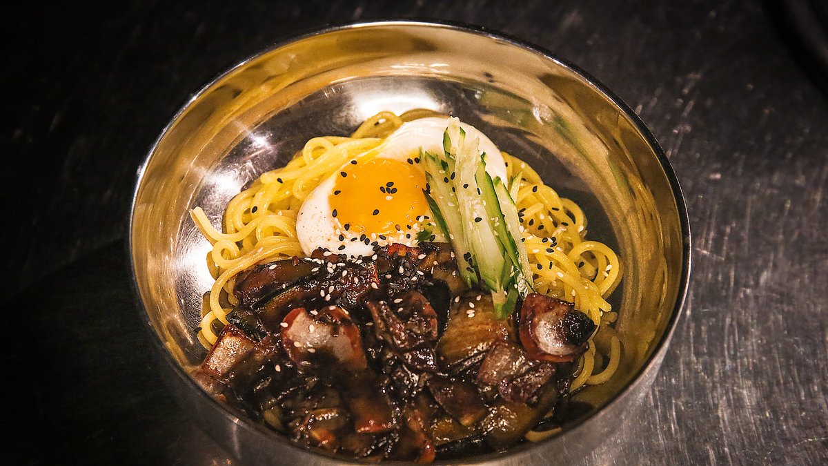 Klasické korejsko-čínské jídlo s nudlemi a bohatou omáčkou z černých fazolí. -- Classic Korean-Chinese noodle dish with a rich black bean sauce.