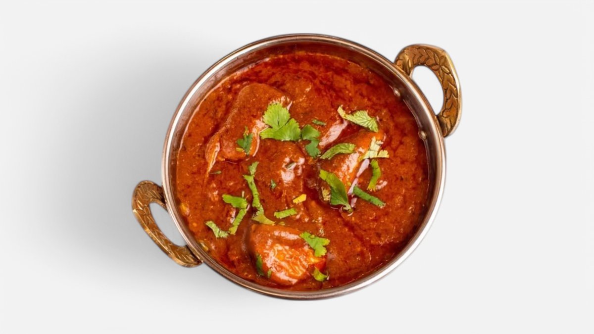 Kousky kuřete pečeného v peci tandoor v husté omáčce z rajčat, cibule a koriandru