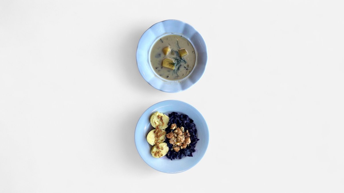 Kulajda s hříbky, bramborem, vegan smetanou a čerstvým koprem (6) Sójové výpečky s červeným zelím a jablkem na víně, bramborový knedlík (1,6)