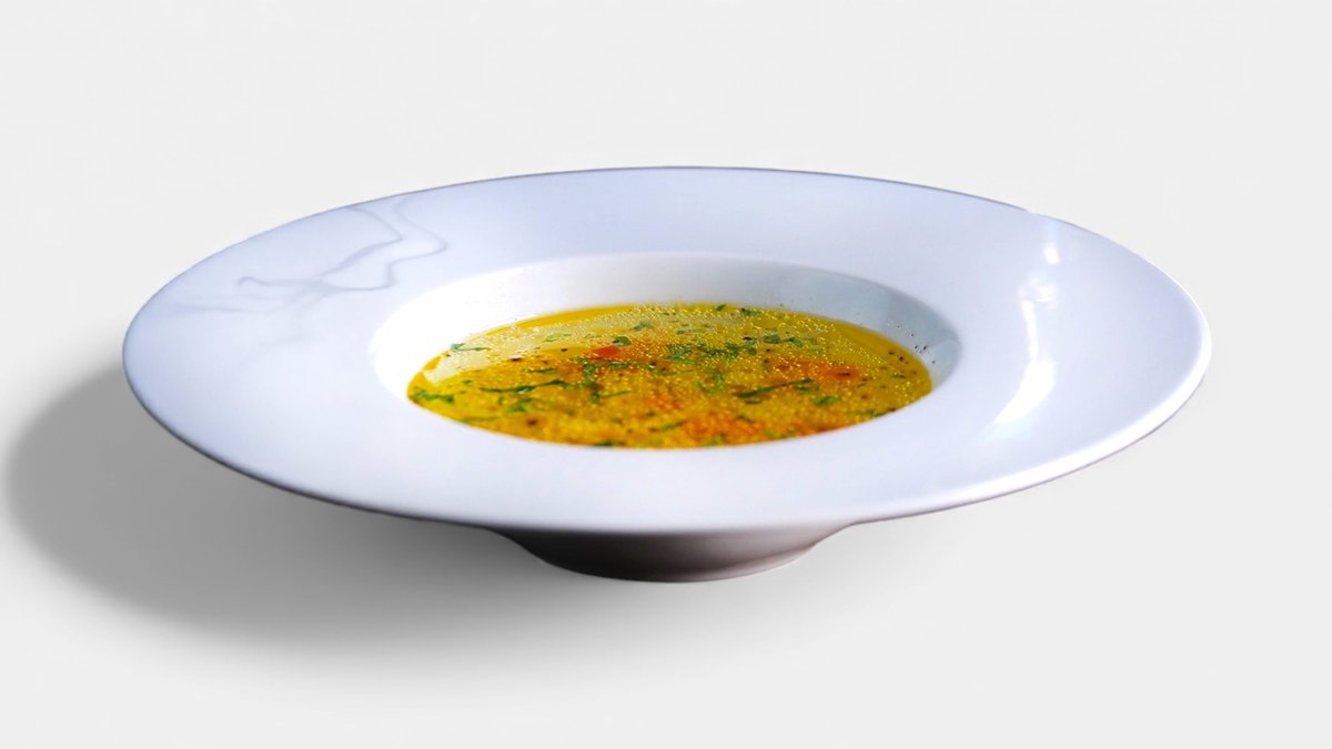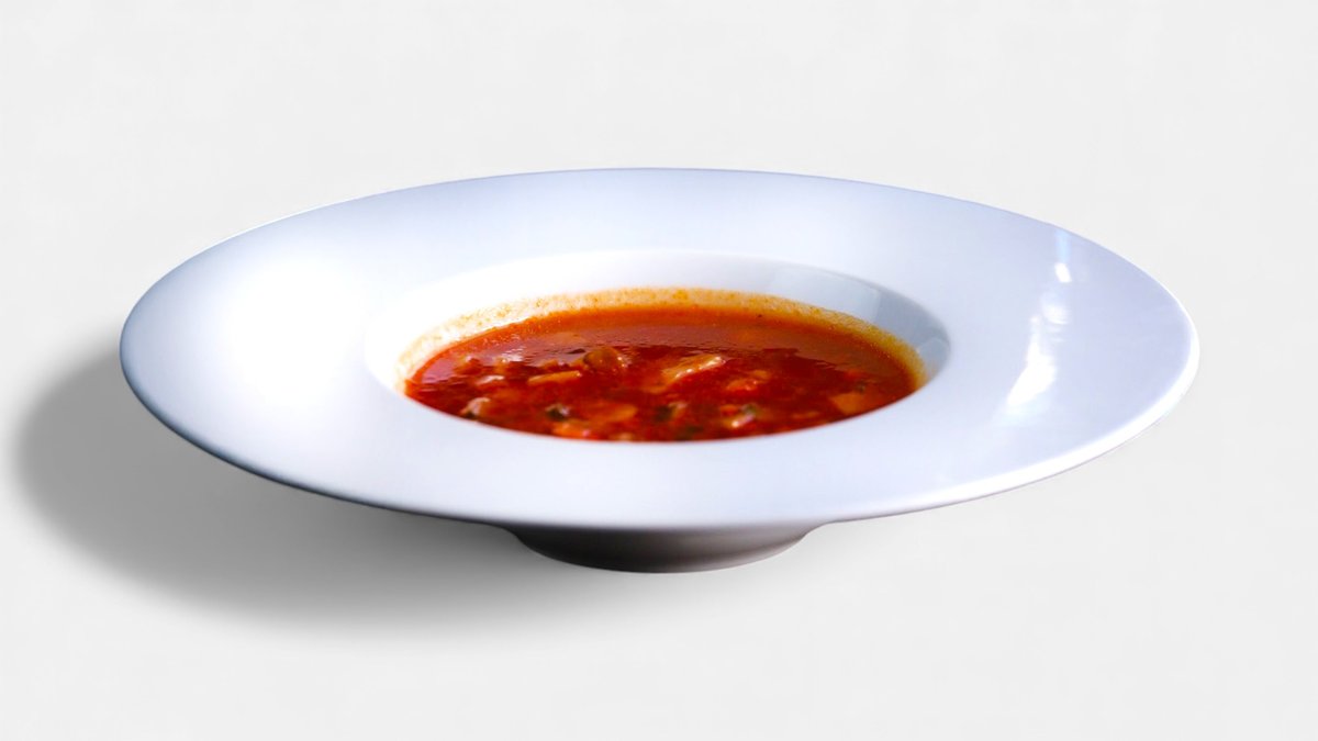 Tradiční italská zeleninová polévka s lilkem, cuketou, paprikou, kořenovou zeleninou a rajčaty, dochucená voňavými bylinkami (7,9)