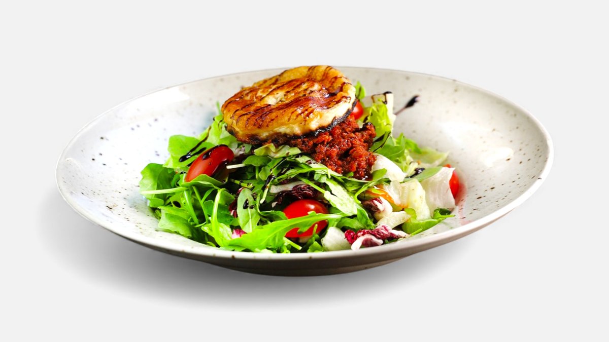 grilovaný kozí sýr, rajčatové pesto, míchaný salát, rukola, cherry rajčata (5,7,8)