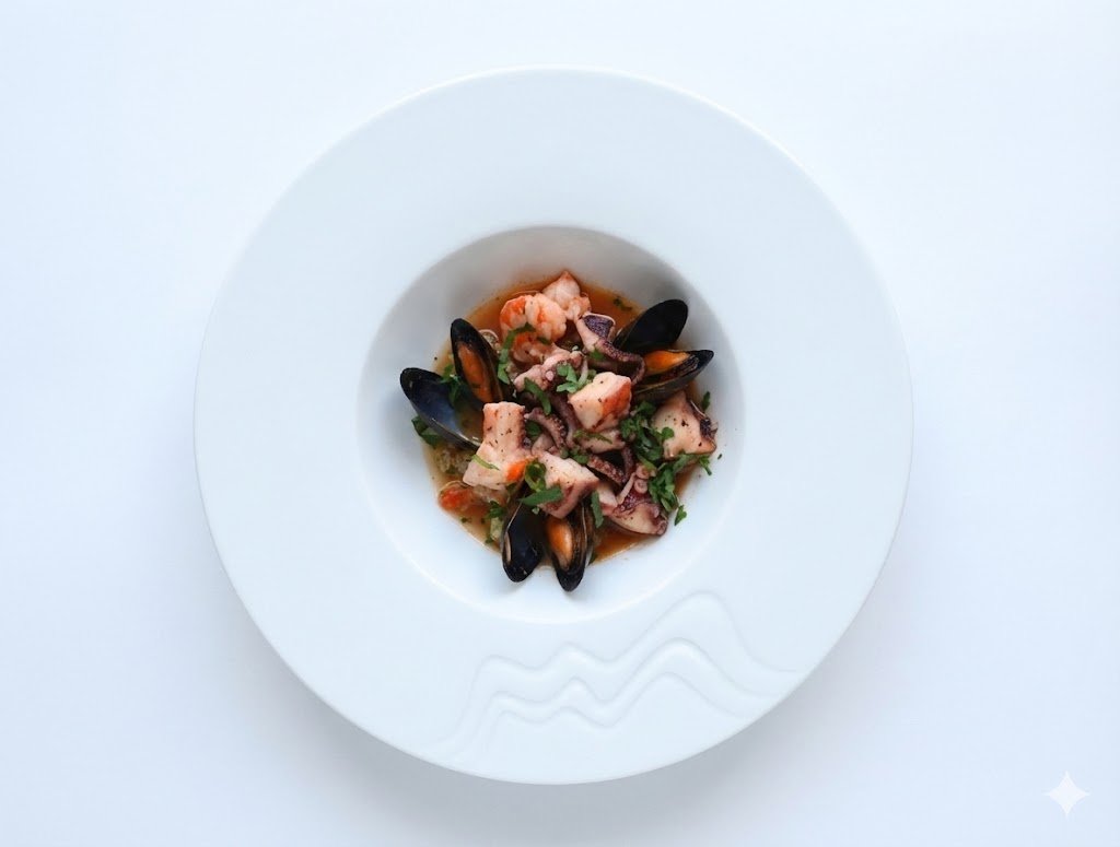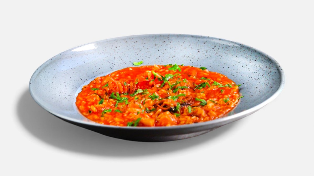 rýže arborio, drcena rajčata s čerstvou bazalkou, chilli, chapadla chobotnice, baby chobotničky, krevety black tiger (2,7,14)