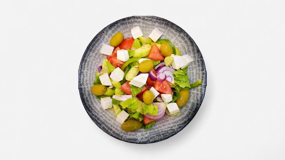 Římský salát, rajče, okurka, paprika, cibule, sýr, olivy