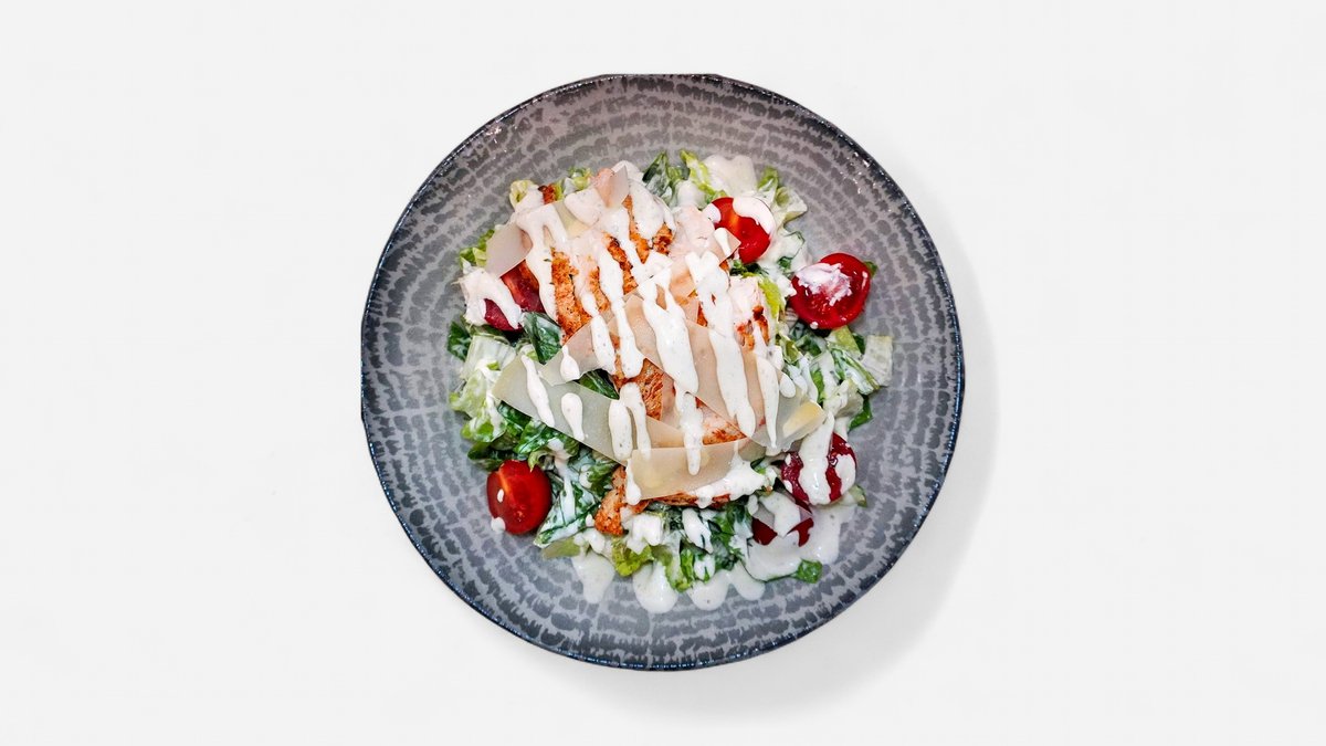Římský salát, kuřecí maso, krutony, cherry rajče, parmazán, dresink