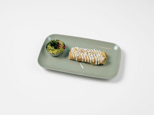 Velká pšeničná tortila plněná fazolemi, sýrem Gouda, rýží a kuřecími prsy vařenými v rajčatové omáčce z chili chipotle. Ozdobené crème fraîche, ledovým salátem a nakládanou červenou cibulkou. Porce fazolí, rýže a omáčka jako příloha.