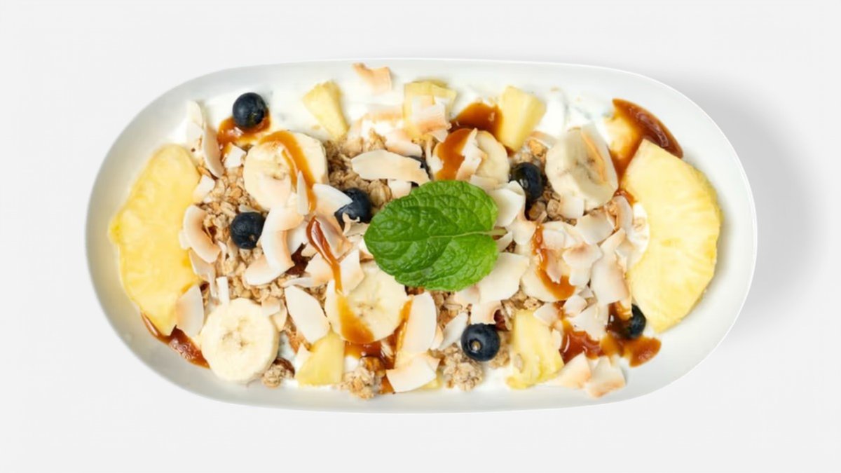 Lehká a osvěžující snídaně, která vás přenese do tropického ráje. Krémový řecký jogurt, zjemněný medem a čerstvou mátou, tvoří dokonale hladký základ. Na něm se vrství křupavá granola, která přidává kontrastní strukturu a jemné oříškové tóny. Hlavní roli hraje šťavnatý ananas a sladké plátky banánu, které přinášejí sluncem prohřátou exotiku. Kanadské borůvky dodávají jemnou svěžest, která vyvažuje medovou sladkost jogurtu. Vše doplněno o jemně pražený kokos, který celý zážitek završuje vůní vzdálených tropických pláží. Každá lžička je jako sousto slunce – svěží, lehká a zahřeje vás u srdce.