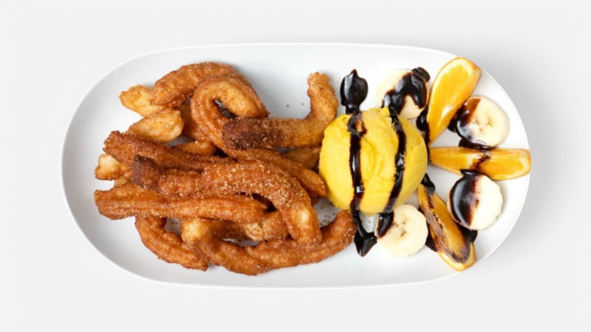 Čerstvě připravené kubánské churros s pravou vanilkou, dokonale křupavé na povrchu a uvnitř jemné a nadýchané, obalené v aromatické směsi třtinového cukru a skořice. Každý kus je smažený dozlatova, aby získal svou typickou lehkou a vzdušnou strukturu. Podáváme s velkorysou porcí vanilkové nebo mangové zmrzliny, která krásně kontrastuje s teplým těstem, doplněné o čerstvé sezónní ovoce, jako jsou pomeranče nebo banány. Na závěr nechybí jemná poleva, která dodává dezertu luxusní chuťový zážitek. Dokonalá rovnováha křupavosti a krémové sladkosti, která vás přenese přímo do slunné Havany.
