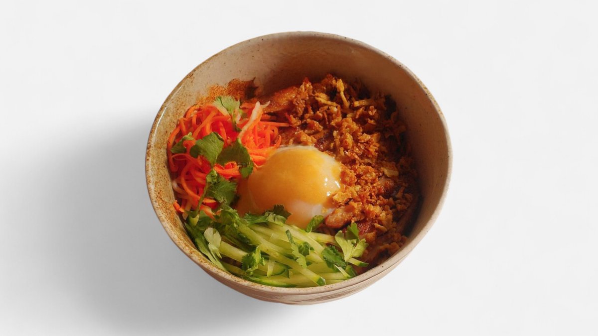 kuře pěti koření, vajíčko 63˚, pšeničné nudle, naše omáčka, zelenina, slepičí vývar (upíjí se zvlášť na straně), 🌶️lehce pikantní (tofu verze není vegetariánská), koriandr