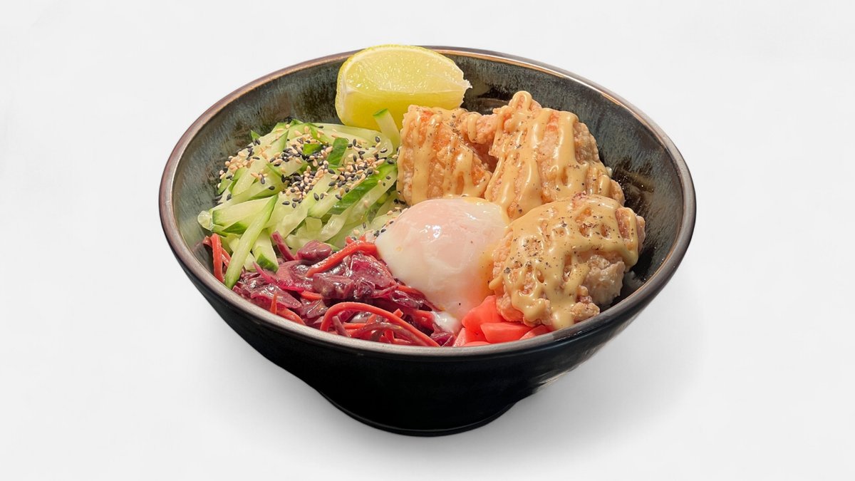 kuře ve škrobu, vajíčko 63˚, coleslaw s japons. kari, zelenina, sójová omáčka s hoisin