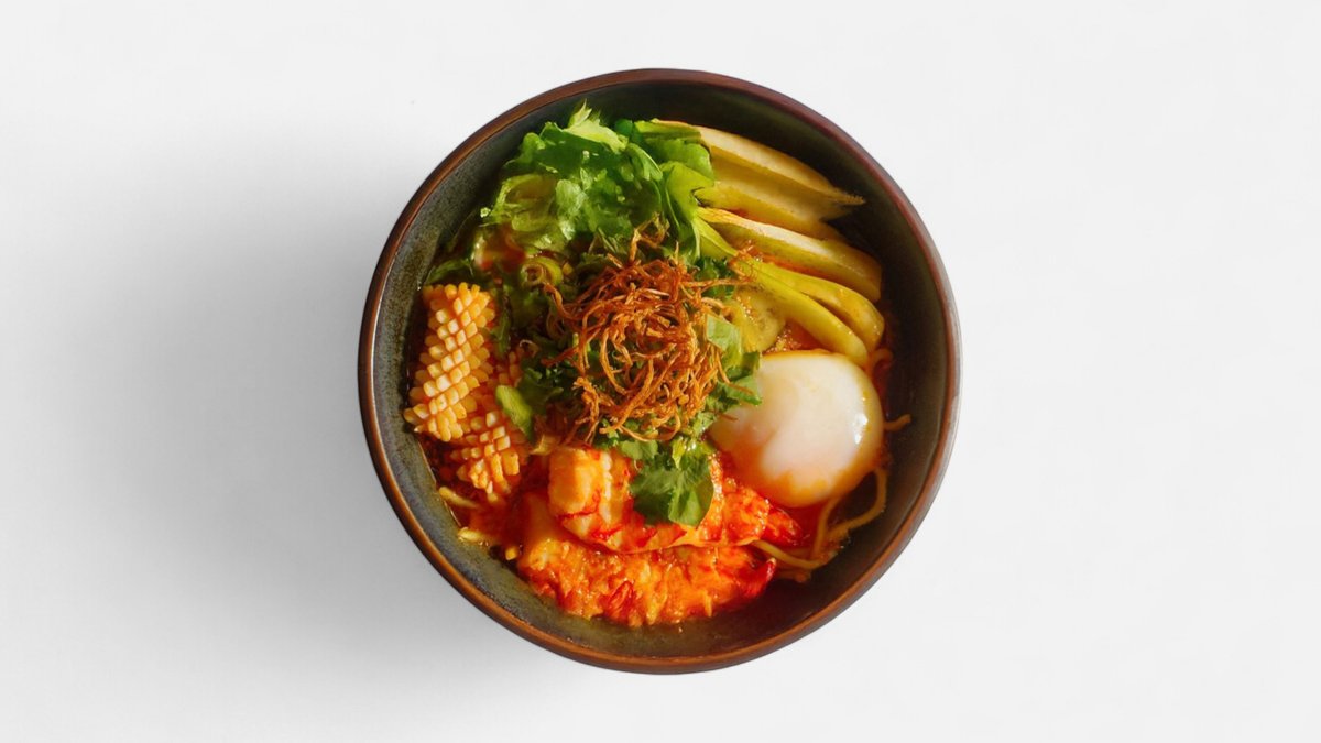 tygří krevety, kalamáry, vajíčko 63˚, pšeničné nudle, zelenina, vypečená hlíva, naše tom yum pasta, krevetový vývar, kuřecí vývar, koriandr