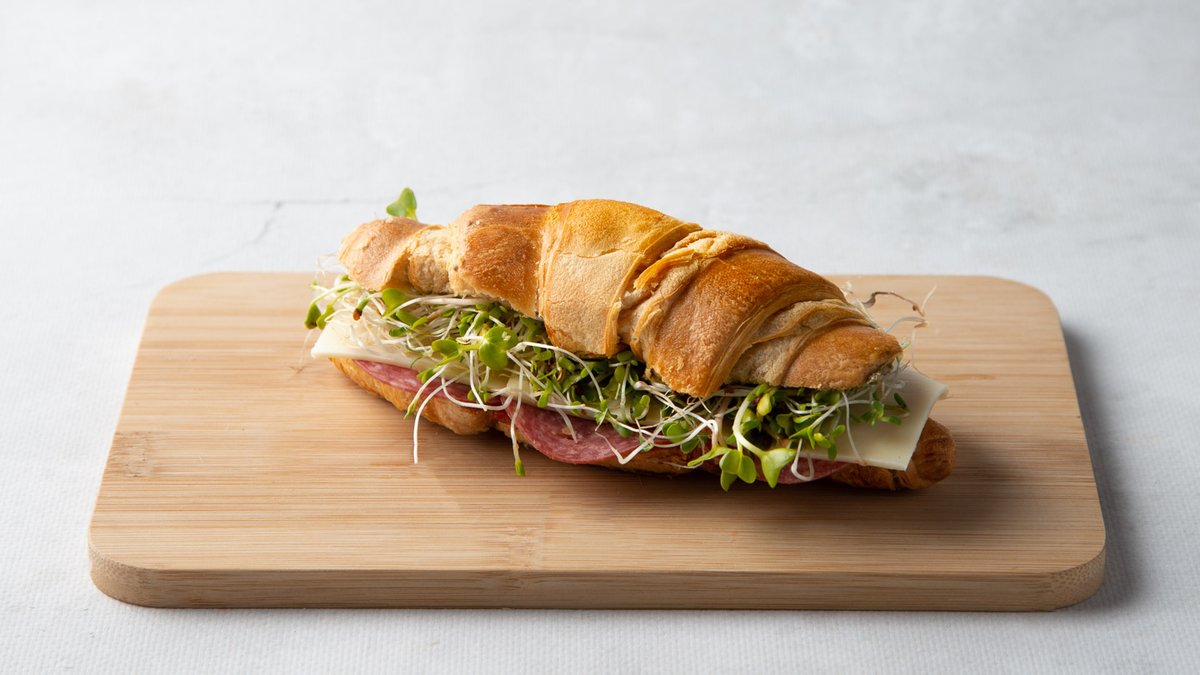 rozpečený domácí máslový croissant, plněný čerstvým avokádem, tvarohem se sladkou uzenou paprikou, mořskou solí, granátovým jablkem, drcenými pistáciemi, sezamovými semínky a klíčky microgreens