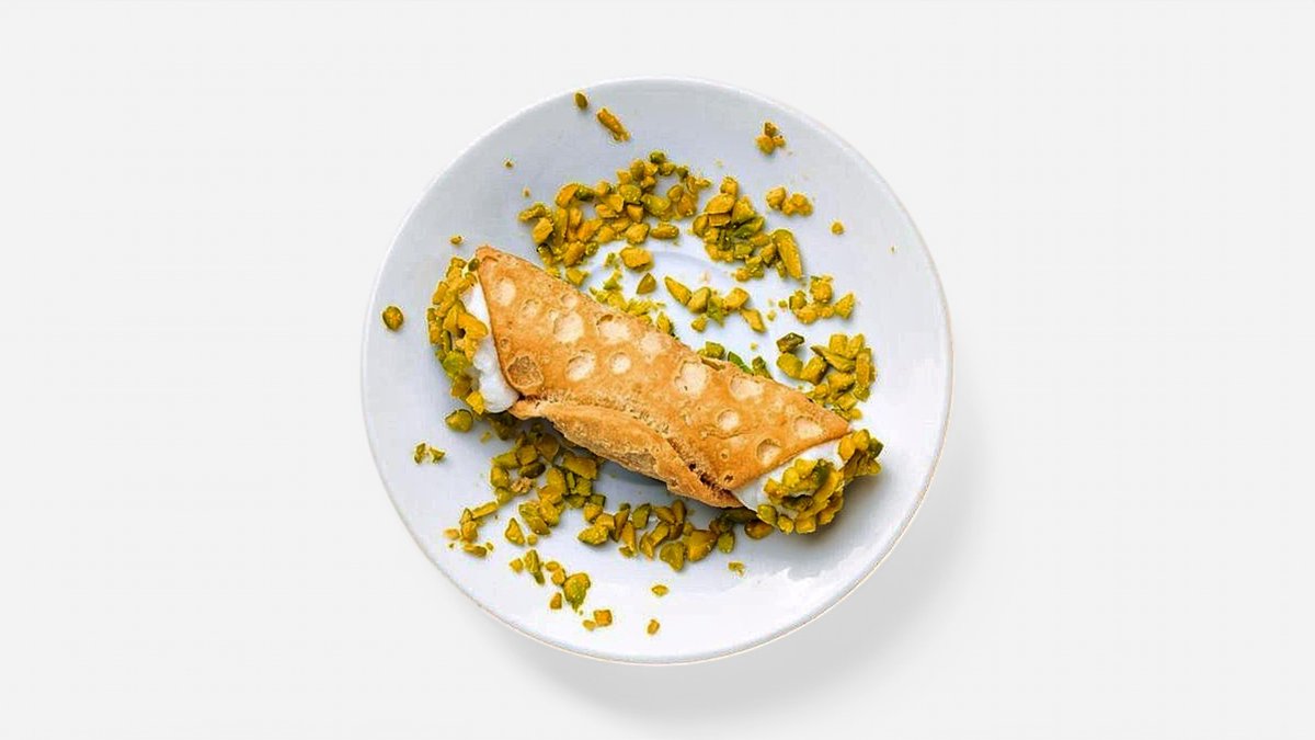 Upečená křupavá rulička z ručně vyrobeného listového těsta z farmářského másla a plněná nadýchaným jemným pistáciovým krémem a pistáciemi na vrchu.