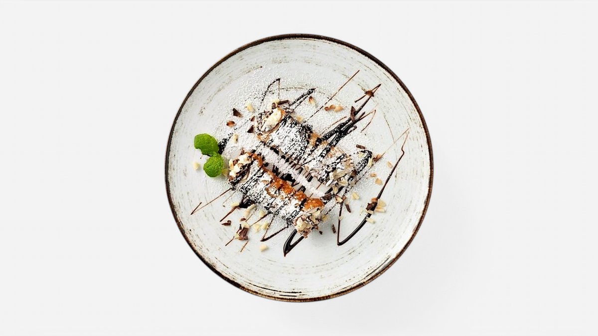 banánem, tvarohovým mascarpone a griliášem, přelité přepuštěným máslem